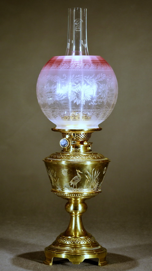 Der Sockel und die Vase bestehen aus sehr dickem, schwerem Messingblech. Die Lampe hat eine Pokalform. Im Sockel ist ein Eisengewicht zum Beschweren angebracht, das allerdings keinerlei Bezeichnung trägt. Sockel und Bassin-Deckel weisen gleiche Verzierungen auf. An der Vase sind zusätzlich Verzierungen in Form von Vögeln und Pflanzen gepunzt. Das Bassin selbst ist aus klarem Glas mit dem passenden Messingdeckel.
