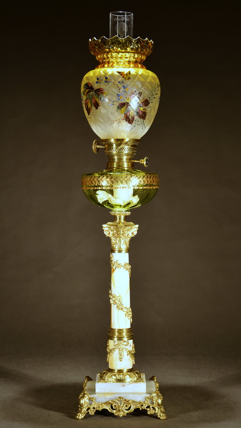 Jahre später habe ich ein sehr schönes Glasbassin mit umlaufender Blättergirlande in Gold gefunden, das im Stil der Lampe hervorragend passte, als ob es für diese Lampe hergestellt worden wäre. Dieses Bassin habe ich in den vorhandenen Metallzapfen eingegipst uns es ergänzt seitdem diese Lampe auf beste Art und Weise. Die Lampe habe ich zuletzt mit einem hochwertigen Elite-Brenner, einem Original-Odin-Zylinder (Marke von Carl Holy für den französischen Markt) und einer wunderschönen, handbemalten Tulpe bestückt.