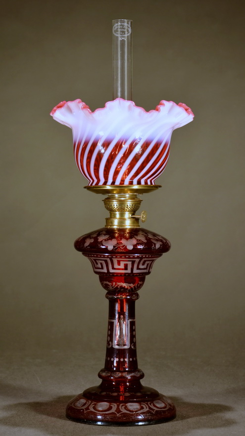 Fuß und Säule sowie das abnehmbare Bassin sind aus böhmischem Glas, rubinrot überfangen oder gebeizt und aufwändig ornamental geschliffen. Es ist das erste Mal, dass ich diese Art Lampe überhaupt gesehen habe. Das Glas ist am Fuß etwas stärker zerkratzt, was jedoch nicht sehr störend wirkt. Bassin und Fuß werden mit einer Gewindestange zusammengehalten. Ich musste die Mutter am Ende der Gewindestange sorgfältig heraussägen, da sie sehr stark verrostet war. Nach erfolgter Reinigung konnte ich eine sehr gut passende Messingscheibe mit einer neuen Mutter anbringen.