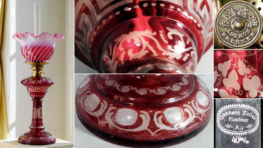 Ein völlig ungewöhnlicher Fund bei eBay USA! Eine durch und durch europäische Lampe wurde dort zum Kauf angeboten. Der deutsche Kosmos-Brenner hatte chinesische Schriftzeichen auf dem Dochtrad. Vermutlich wurde die Lampe gegen Ende des 19. Jahrhunderts in China gekauft und kam mit chinesischen Auswanderern nach USA. Und von dort trat sie die Heimreise nach Deutschland… Ob sich das tatsächlich so ereignet hat, kann nicht mehr herausgefunden werden; aber denkbar ist es schon.