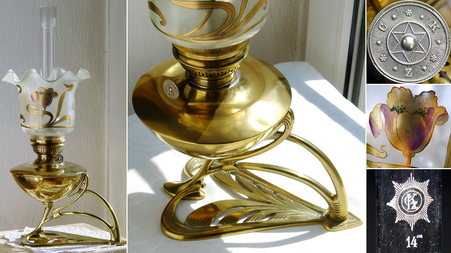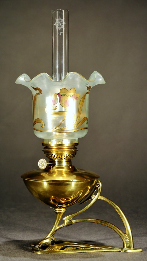 A pure Art Nouveau lamp by the Hungarian lamp manufacturer Lámpa-Gyár in Budapest. It is shown in the catalogues of this producer with a Vesta shade. Dr. Touché described it in his book as a German lamp, but this is incorrect.