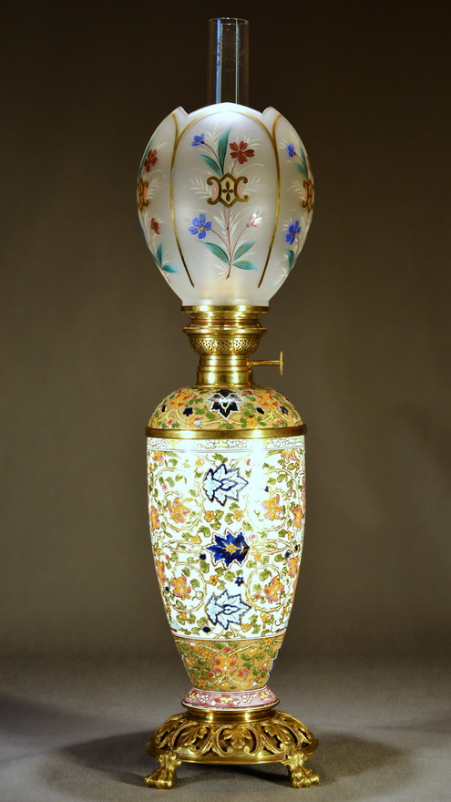 The painting of the vase and the font lid is very typical for Ignác Fischer. Stylised flowers are embedded in the middle of an area-filling, complex tendril pattern. A similar lamp with the same painting also exists in another version with a diagonally ribbed vase.
