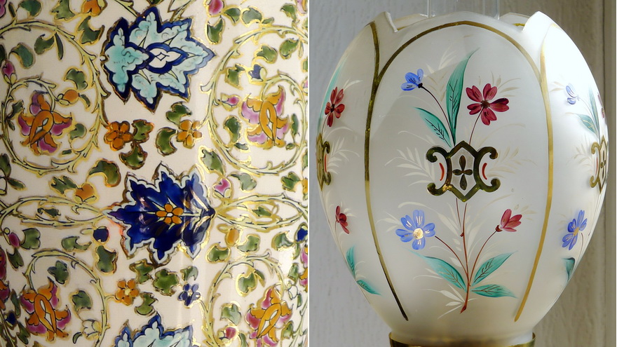 An old tulip shade with hand-painted floral motifs in gold-framed cartouches fits this lamp perfectly.