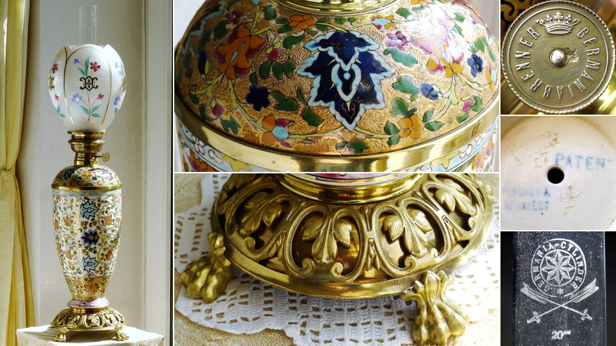 Another Ignác Fischer lamp made of painted ceramics. A great find in Budapest as a souvenir and unfortunately also very expensive fun! When my wife and I found this lamp in an antique shop in Budapest, I hesitated for a long time before buying it, because it was broken several times and glued together in a completely amateurish and miserable way! The antique dealer had had to fetch it from a warehouse in the back when I asked him about kerosene/paraffin lamps. A professional repair would cost a lot of money. But how often does one find an Ignác Fischer lamp? Maria encouraged me to buy the lamp after all. So the lamp came with us to Germany to be kissed awake from its Sleeping Beauty slumber.