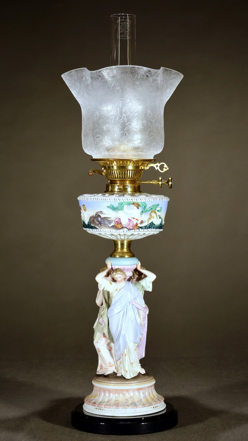 One of the most eye-catching porcelain figural lamps in my collection. Three female figures in Greek clothes carry together a font holder. The figures are painted differently. The porcelain font differs from the female figures with its Capodimonte style. This British lamp is probably from 1890-1900. There are other copies that are quite different in design and quality.