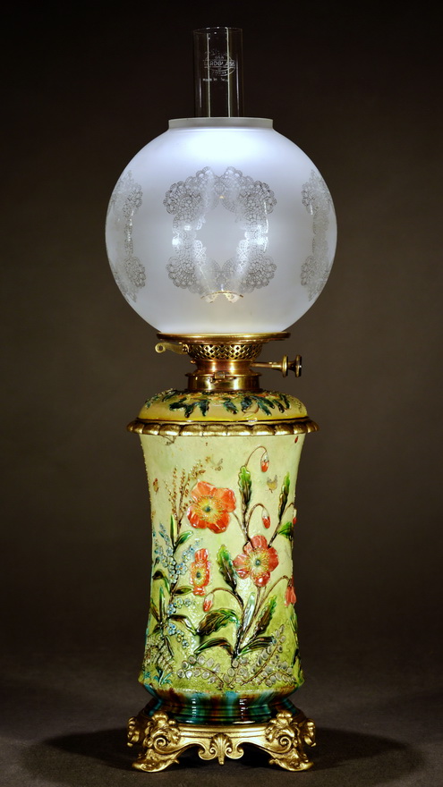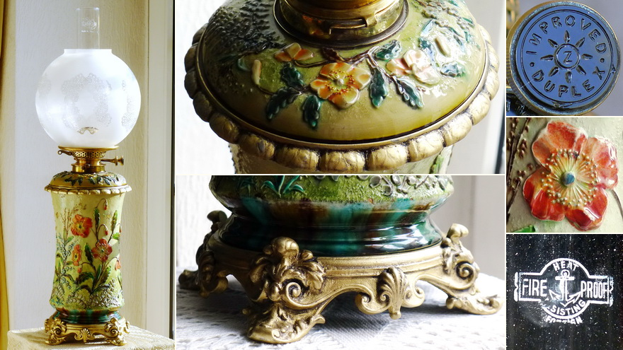 The lamp has a British burner and the matching bayonet collar, but I have a feeling that it originated in Germany, as the cast zinc parts (base and top ring of the vase) are rather German. It is possible that the lamp was produced in Germany but for the British market. I have ultimately defined it as a British lamp.
