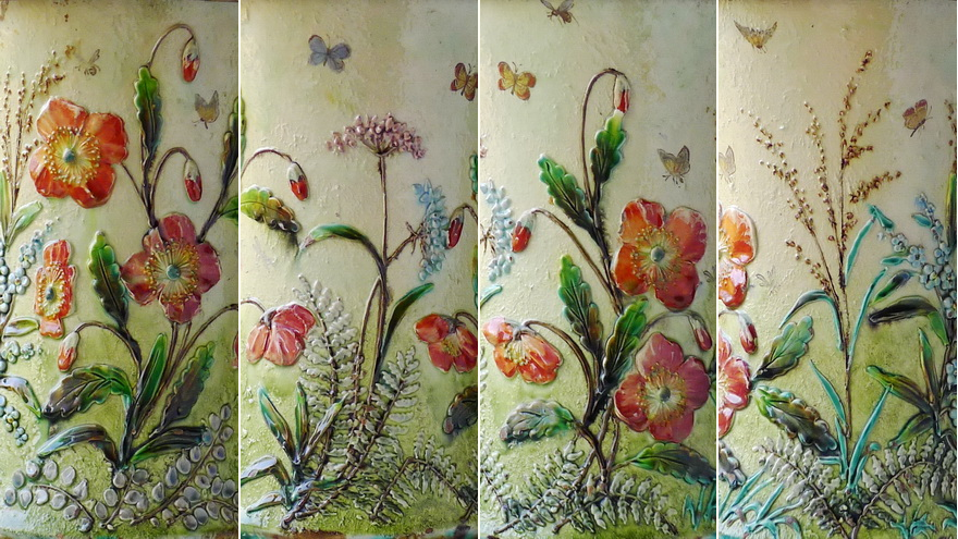 Vase of elaborately painted majolica, in slightly concave cylindrical form, with sculptured plants in natural reproduction and many gossamer painted butterflies, Ø 142 mm. The ring at the top of the vase is also made of cast zinc. In the vase an additional container made of sheet brass.