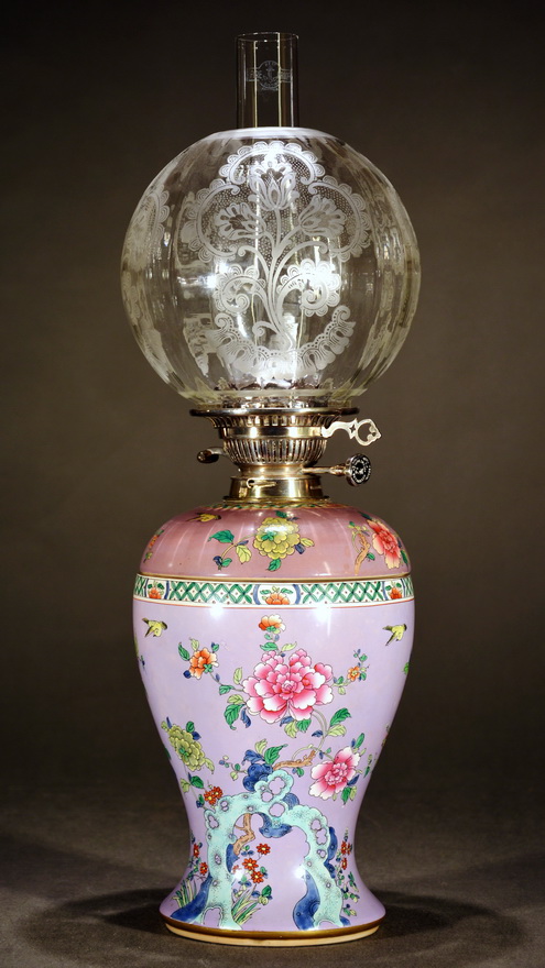 A beautifully patterned ball shade in Art Nouveau style and a Duplex chimney have completed the lamp in a very stylish way.