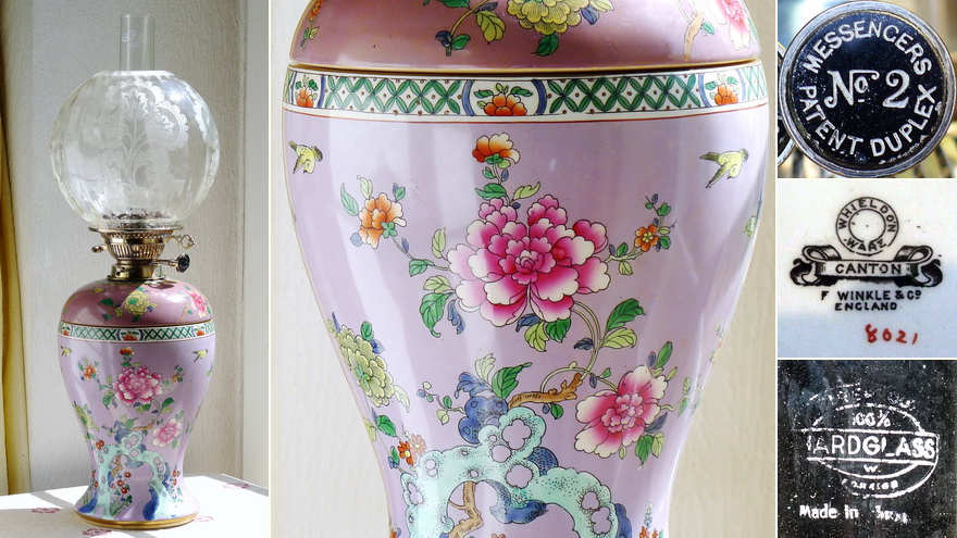 The ceramic vase bears the widespread pattern "Canton", which is applied to various ceramic products of this company (partly also in different colours). Since the manufactory changed its name to F. Winkle & Co. Ltd. in 1911, the lamp must have been made before 1911. The pattern is reminiscent of Chinese flower painting in Famille rose colours, and this probably initiated the name "Canton". All the black outlines are printed, the colours are hand-painted.