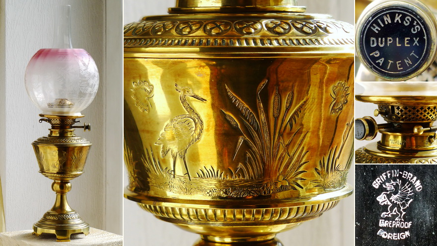 An older brass lamp by Hinks & Son, from about 1880 (dated by the burner), made of heavy, thick brass with pressed/punctured decoration. First class, solid lamp, which I purchased in an antique market complete with its extremely rare burner.