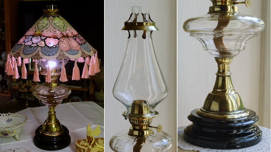 Fortunately, after some time, I managed to get an original Victoria chimney of Young, and in the right size! Once the burner and chimney were together, I was on the lookout for an older lamp to use these parts. The lamp I chose for this Victoria combination fits perfectly in size and style. The font is made of transparent colourless crystal glass, carefully hand-cut with sliced cuts at the top and bottom. The base is made of black glazed ceramic, as usual. The column is of plain stepped brass sheet. A thoroughly time-honoured English lamp, probably from around 1870-1880...