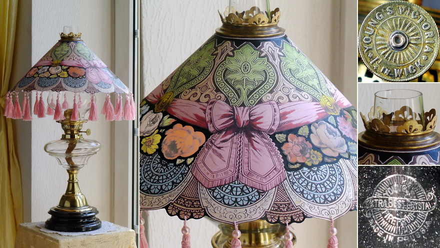 An old British lamp that I fitted with a homemade cardboard shade. The story of how this came about is interesting: I had been given a British lamp that had a large flat burner by Young. After my research in Veritas catalogues, it turned out that this burner was the largest of 4 Victoria burners by Young. For this burner they designed their own chimney with a very wide, almost angular bulge. However, I did not have this chimney. So the burner went into the drawer and the lamp got a completely different, famous burner (see L.186).