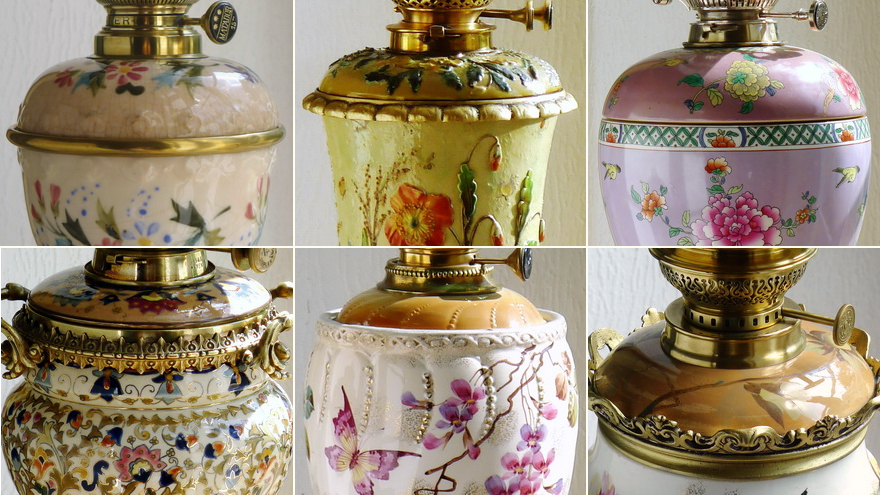 Sometimes in the small depressions or along the thickly applied brush strokes of a pasty painting on glass fonts, or in the depressions of strongly reliefed majolica, there is a dark brown, almost blackened and dried-out soiling, which comes about through the mixing of the kerosene/paraffin vapours with the usual air pollution (e.g. dust particles). While in normal cleaning by dusting etc. the raised parts of the painting are continually wiped and cleaned, this soiling remains in the fine recesses and gums up with time, thus becoming solid. This blackish soiling can also be easily dissolved and removed with acetone. For this purpose, I recommend using normal cotton swabs (to wet the depressions generously with acetone) and pointed wooden toothpicks (to remove the softened dirt from the depressions), but never knife tips or other sharp, metal objects. These encrustations may be so stubborn that you have to repeat the cleaning procedure until the recesses are really clean. If you love your lamps, you have to work on them patiently.