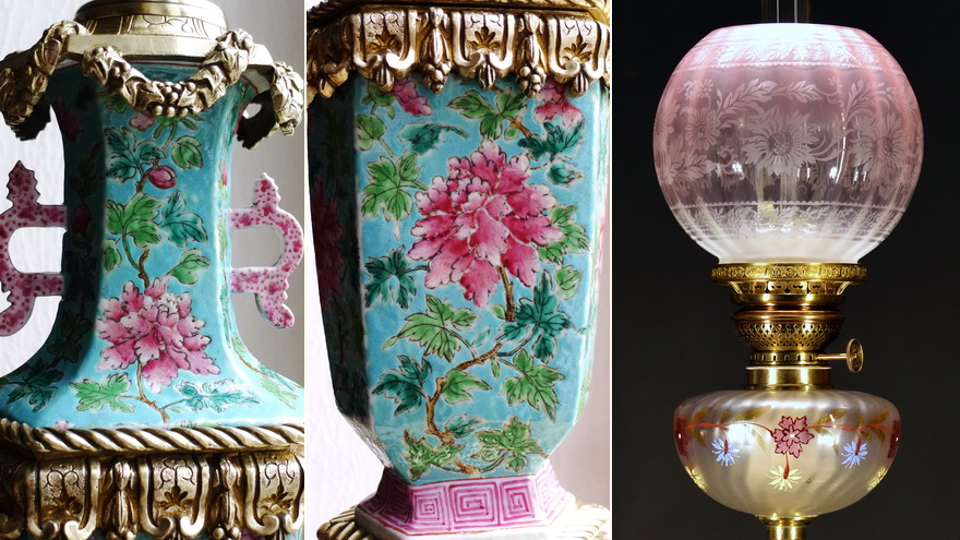 An old Chinese 6-cornered porcelain vase with Famille Rose painting was cut down the middle and transformed into an elaborate Moderator lamp, probably mid 19th century. Brass mounts were specially made for the parts of the vase. This can be seen in the fact that the base, for example, was made to fit the somewhat irregular hexagonal foot of the vase.