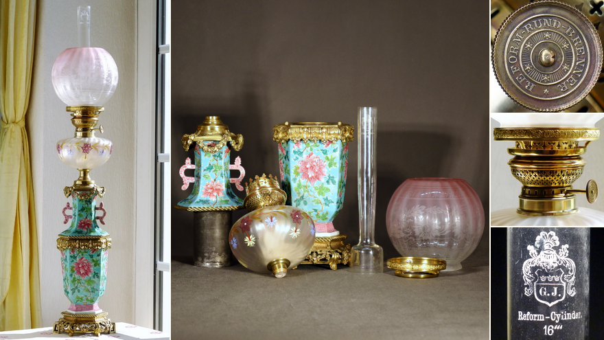 I was able to complete the lamp very well with a 16’’’ Reform Kosmos burner incl. Kalthoff chimney and a Vianne ball shade. I constructed the matching globe holder myself.