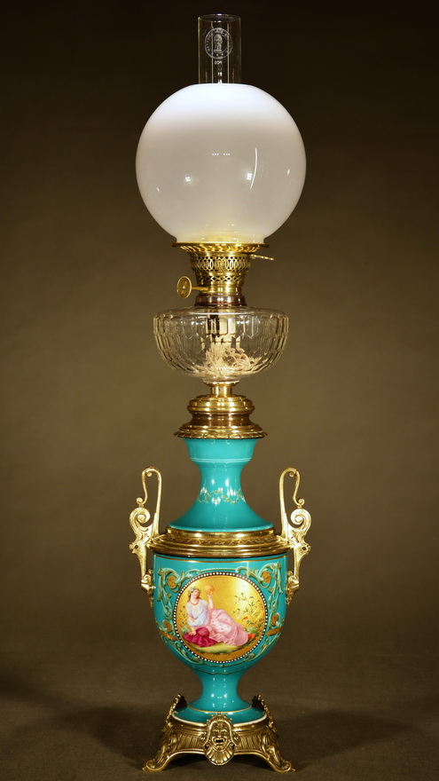 Original oil reservoir of sheet brass; top with long neck of painted porcelain, matching the vase, removable.