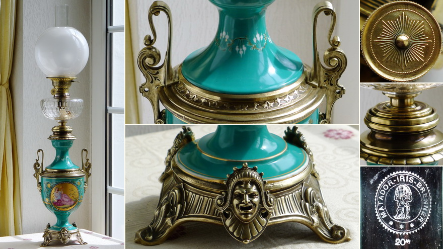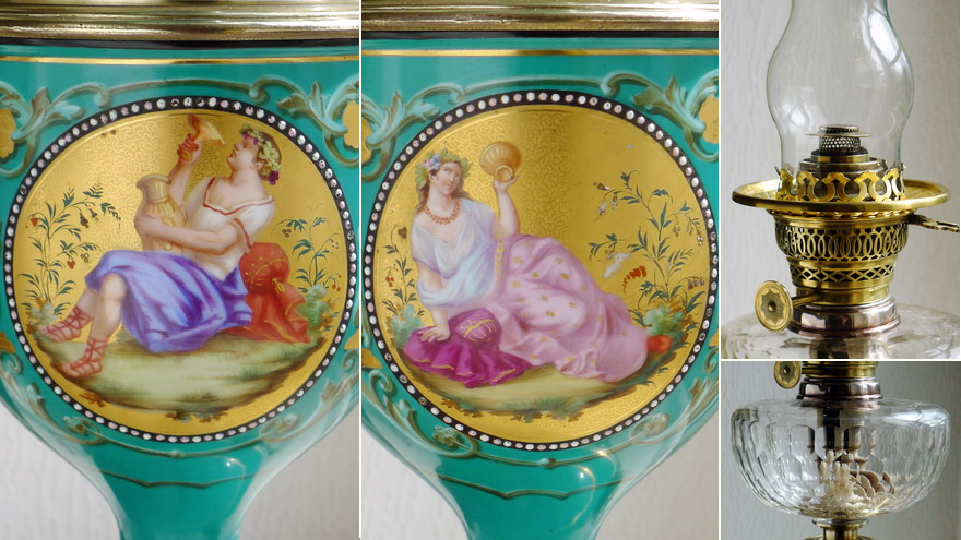 The green-glazed porcelain vase has painted scenes from the Roman period in two large cartouches at the front and back, which are in excellent condition. Inside the vase is the original oil reservoir made of sheet brass, from which the Moderator technique has been completely removed. On top of this reservoir sits a further elongated porcelain neck with painted decorations.