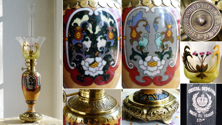 A small, delicate French Cloisonné lamp, the two-piece vase of which was obviously produced for kerosene/paraffin lamps. Production probably around 1900.