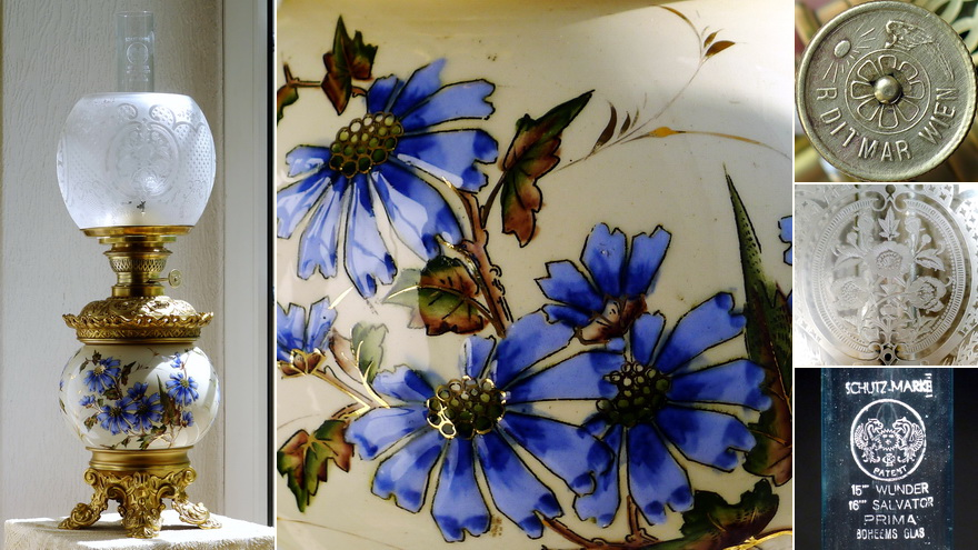 I used a 15’’’ Saturn burner from R. Ditmar in this richly decorated lamp. An extremely finely and accurately etched ball shade for gas lamps suited the spherical shape of the lamp very well. To be able to use this shade with 109 mm bottom opening, I had to combine a rare 115 mm globe holder (lucky find in eBay UK) with a conventional 85 mm globe holder for 15’’’ burners.