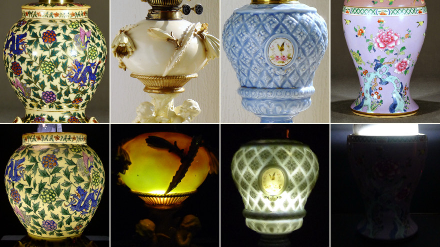 Porcelain, historically considered the noblest ceramic product, was as well used for various types of kerosene/paraffin lamps, just like earthenware, majolica and stoneware. Here, too, one finds all kinds of designs from simple, thin-walled, smooth porcelain to highly structured porcelain worked in relief or even shaped into sculptures. The focus, however, is now more on artistically high-quality painting. Since many famous porcelain manufactories participated in the production of lamp parts, these pieces almost always bear the corresponding porcelain marks.