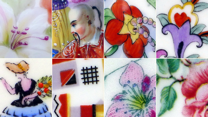 Examples of hand-painted, hand-coloured and printed motifs on porcelain (some greatly enlarged)