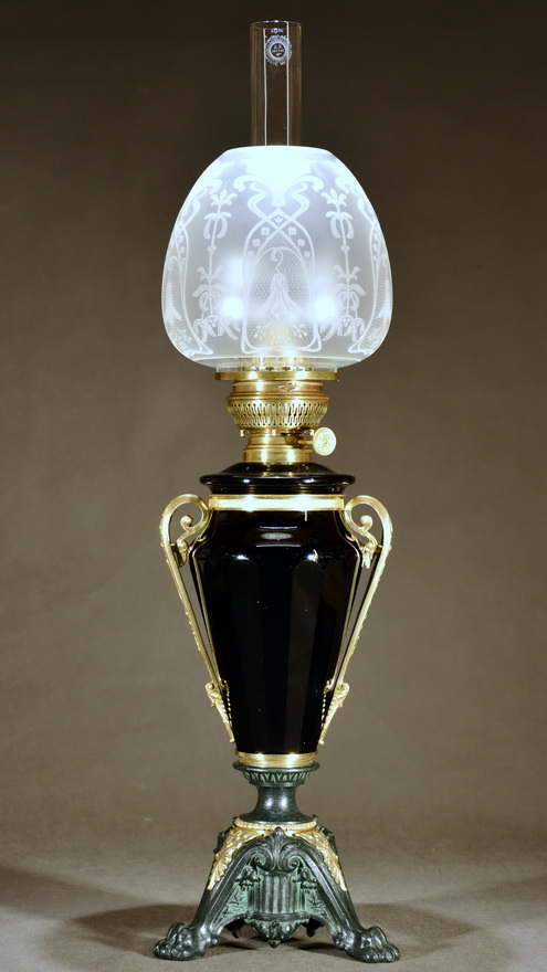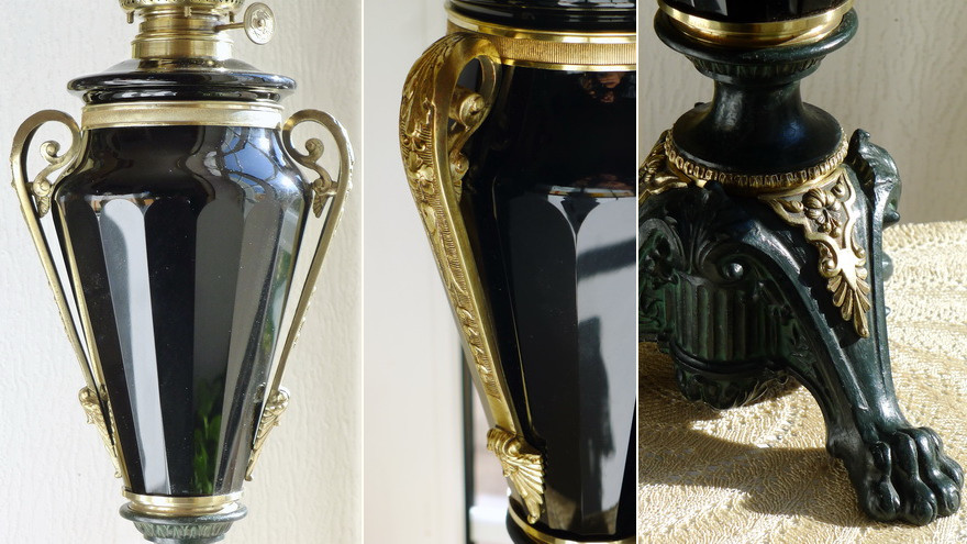 An Art Nouveau shade in the shape of a beehive, which I was lucky enough to buy, completed this lamp. The shade is stylistically not very suitable, as it is clearly from the Art Nouveau period and therefore probably 20-30 years younger than the lamp, but its size and shape are very suitable.