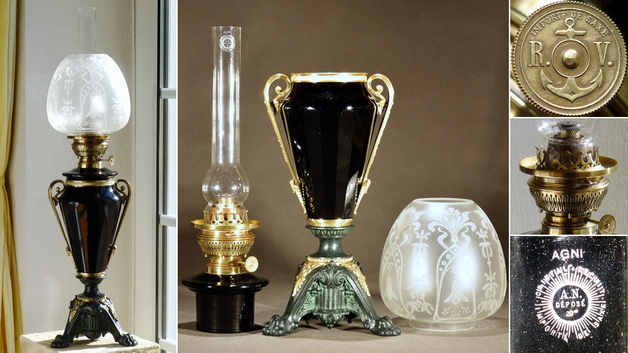 The included Stübgen burner is high quality in itself, but not quite suitable for this large lamp. Therefore, a large Agni burner was used here. And to my great good fortune, I was also able to buy a marked Agni chimney on eBay FR.
