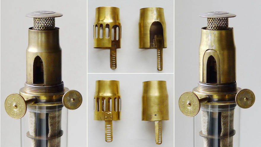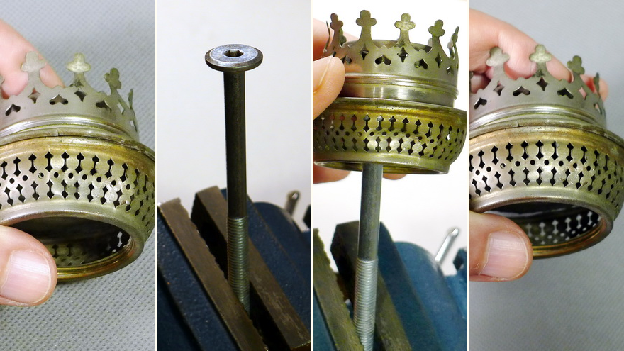 It often happens that some prongs of the gallery are either broken or missing completely. The broken prongs often only have a crack on one of their bridges (in my jargon, these are the narrow bars that connect the upper part of the prong to the lower part of the gallery). These cracks can be soldered from the outside with a small soldering iron. It is important to grind the soldered joint a little flat afterwards, as the fitter of the glass shade must pass by unhindered, but again not so flat that the soldered joint comes apart again under the slight tension. The missing prongs can possibly be added by sawing off the prongs of a broken, no longer usable burner whose gallery prongs have an identical or very similar punched shape and soldering them back onto the places of the missing prongs. You have to weigh up for yourself whether this Sisyphean task is worth it. If only one or two prongs are missing, I wouldn't bother, because the remaining prongs have enough tension to hold the glass chimney firmly and securely. If there are so many prongs missing that the glass chimney can no longer be held, you have to think about how best to solve the problem. In one case, I got a burner whose entire gallery had probably been replaced because the gallery was visibly soldered to the basket all around. That would also be an alternative, at the cost of giving up the originality of the burner.
