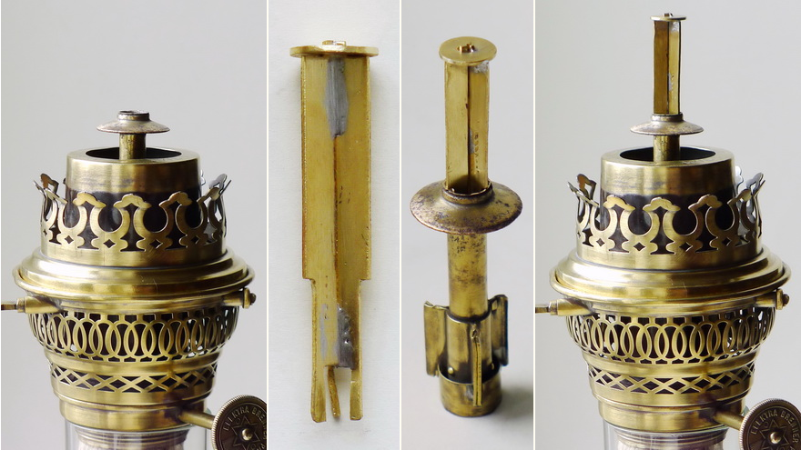 A very similar repair is, for example, to replace the missing extinguisher, if this is possible at all. There are different types of extinguishing mechanisms, some of which have very complicated designs (see the subchapter on Raiser and Estinguisher in the chapter Kerosene/Paraffin Burners). But here, too, it is necessary to obtain an original model of the missing part. So I succeeded in reconstructing the completely missing extinguishing tube of a 20'' Matador burner with spare parts, after I was able to acquire a completely preserved burner of the same type. My reconstruction also works perfectly.,