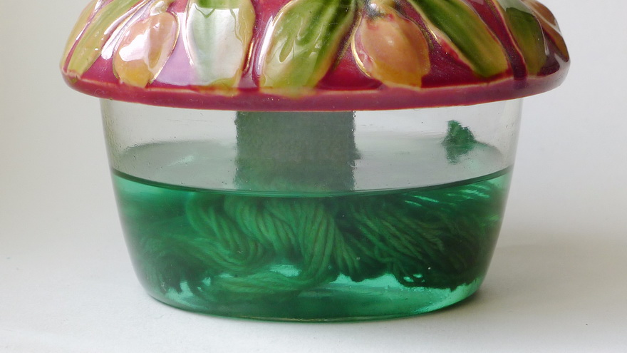 If you leave a lamp with kerosene/paraffin in the font for a longer period of time (1-2 years), the kerosene/paraffin may turn green over time (see photo). This colouring may look interesting or beautiful, but it damages the wick considerably, because the green crystals of copper carbonate that are formed really clog the capillaries of the wick. The wick can no longer transport enough kerosene/paraffin to the burner; the flame becomes weaker and weaker until it eventually goes out completely. Unfortunately, copper carbonate is insoluble in water; therefore, it does not help to try to clean the wick with a dishwashing detergent and a brush. You should discard the green coloured kerosene/paraffin and leave the wick in an acid solution (e.g. 10-15% hydrochloric acid; available in hardware stores) for a few hours. Acid dissolves copper carbonate gradually. Afterwards, you can clean the wick as usual with washing-up liquid.