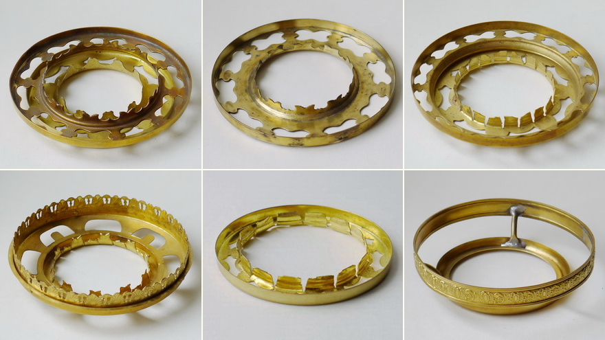 Bottom row, from the left: The small brass plate soldered on the inside to connect the two ends of the decorative hoop