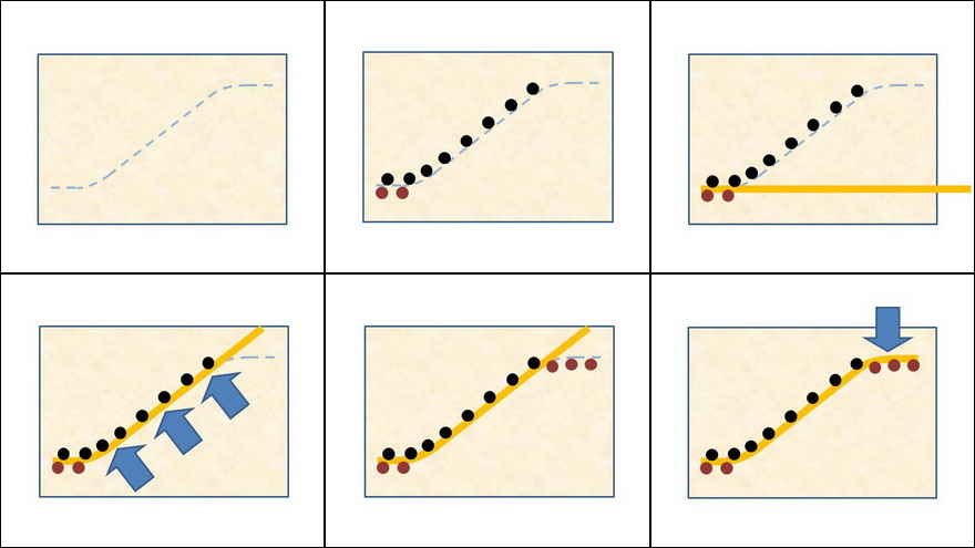Bottom row, from left: First bend of the brass rod on the nails