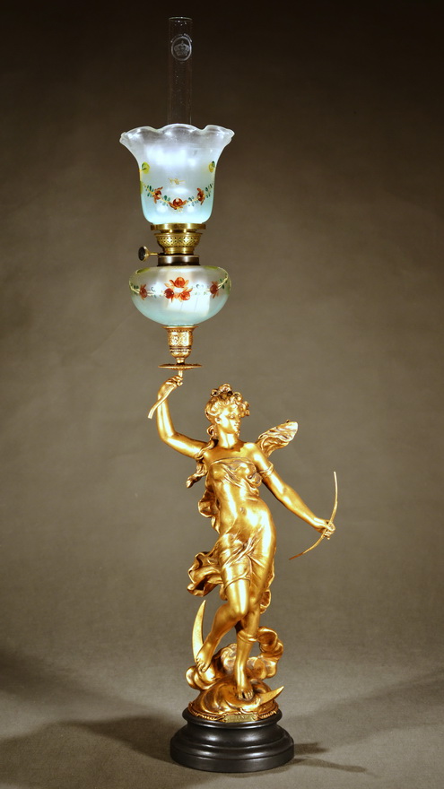 One of the typical French figural lamps with a female figure in French Art Nouveau as the embodiment of Diana, the goddess of the hunt. This cast zinc figure is mounted on a wooden base as usual. The lamp was probably made around 1900-1910.