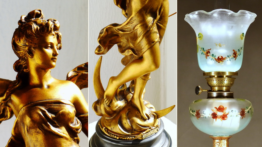 After adding the missing bow that I constructed with iron wire and after bronzing the whole sculpture with a dark gold tone (Florentine gold), the lamp shines in a new light!