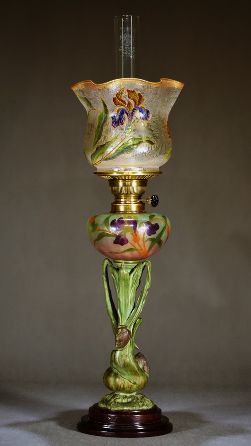 Iris flowers are painted in lively colours on the glass font. The metal undermount of the font has been patinated in the same shade of green so that it is an original part of the lamp.