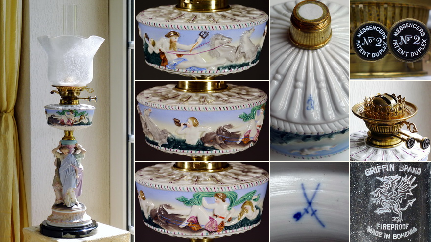 The porcelain parts of the lamp seem to come from German manufacturers (probably from Thuringia), but specially made for the British market. The column part with three women is very finely modelled and painted. It reminds me of Royal Dux in Bohemia, or Worcester in England. Both manufacturers would, however, sign with their own brands. However, the porcelain is marked on the inside with an imitation of the Meissen swords. The font is in Capodimonte style and is marked with an R. I could not identify both signatures. This font was also seen on another British lamp.
