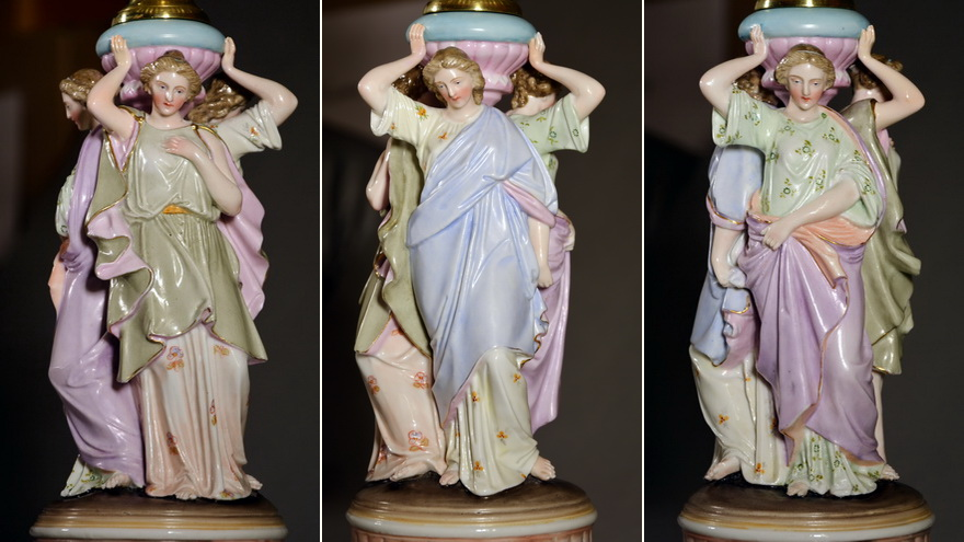 One of the most eye-catching porcelain figural lamps in my collection. Three female figures in Greek clothes carry together a font holder. The figures are painted differently. The porcelain font differs from the female figures with its Capodimonte style. This British lamp is probably from 1890-1900. There are other copies that are quite different in design and quality.