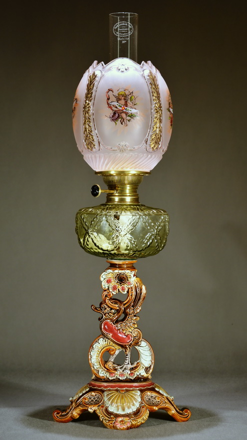 The lamp body (base and column part) is actually the lower part of a two-part ceramic ostentatious vase from Wilhelm Schiller & Sohn in Bohemia. A stylized griffin forms the column. Base 18.8 x 23.9 cm, marked below: W.S. & S. 11406 and painter's signature.