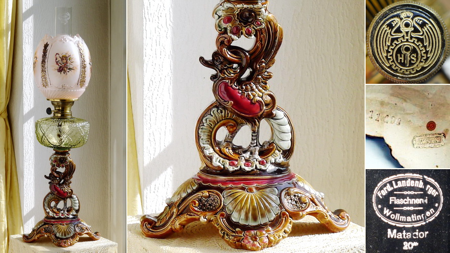 The lamp probably consists partly of the lower part of a large, magnificent vase or bowl by Wilhelm Schiller & Sohn. I found a picture of the original, complete vase on the internet (from an auction in 2013; see last photo, left). Now one can speculate: Either the upper part of the vase broke and a lamp was constructed with the lower, undamaged part (then as a unique specimen), or the upper part of the bowl was not even attached, and the remaining base parts from the factory were used for the production of lamps that were regularly marketed. I don't know if we can ever clear this up...