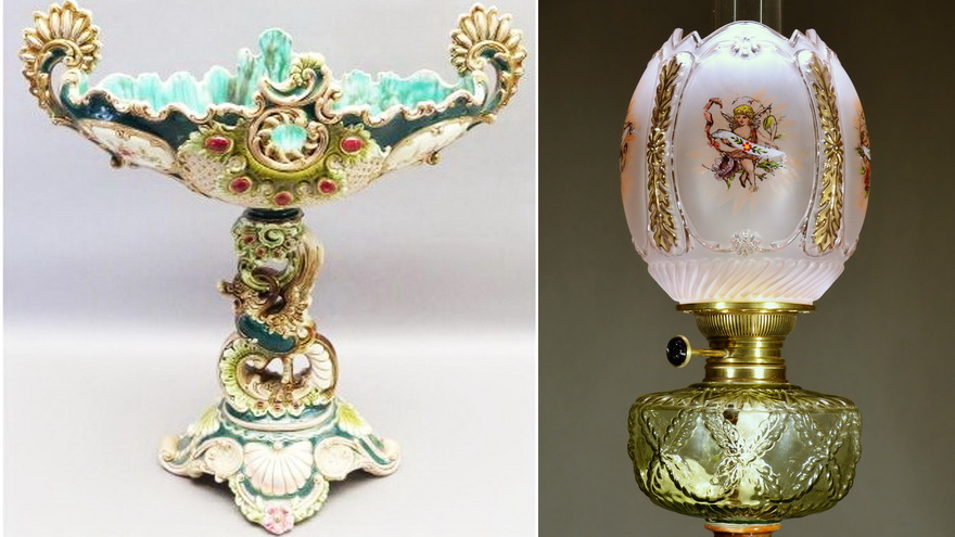 A very eye-catching and extraordinary sculptural lamp made of brightly painted ceramic from the Bohemian manufacturer Wilhelm Schiller & Sohn in Bodenbach (today a district of the northern Czech city of Dĕčin). This ceramic factory was extremely active around 1890-1900 and shaped this excessive style. From the model number 11406 one can deduce that this ceramic was made in the later period of manufacture.